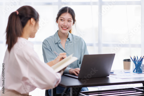 Obraz premium Checking the numbers. Team of Asian young business people analyzing data using a computer while talking about marketing strategy and planning working in the office