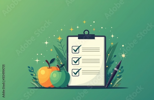 Fototapeta premium Checklist with apples and pen represents healthy food plan. Visual graphic shows meal prep goals. Organic ingredients are checked off list. Nutrition and wellness theme.