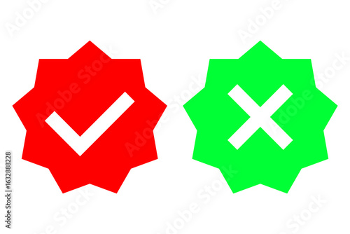 © Полякевич Олена, Obraz premium Checkmark approval icon. Cross mark rejection. Vector star symbols. Red green contrast.