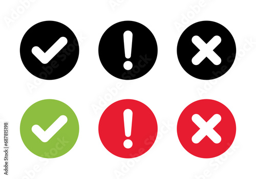 Fototapeta premium Checkmark, exclamation, and cross mark icon on circle background. Check, warning, and x symbol vector