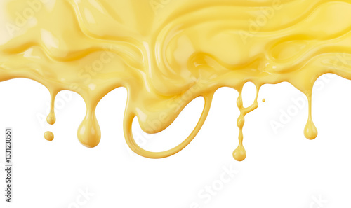 © Anusorn, Naklejka premium Cheddar cheese sauce flowing isolate on white background, yellow cheese melted, 3d rendering.