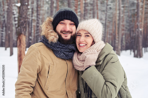 © ArtFamily, Fototapeta premium Cheer couple embracing over a picturesque wintry forest