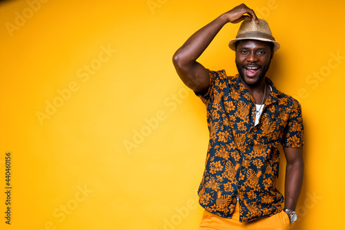 © DmitryStock, Fototapeta premium Cheerful african american man in a hat and in a colorful shirt smiles broadly touching his hat