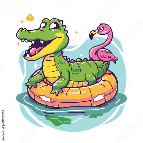Fototapeta premium Cheerful Alligator and Flamingo Enjoying Summer Floatation in Water