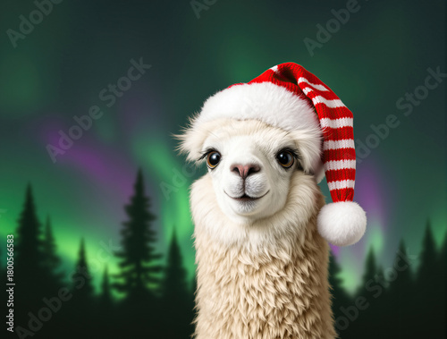 Obraz premium Cheerful alpaca in santa hat with northern lights and pine trees
