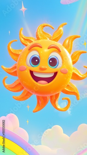 Fototapeta premium Cheerful and Smiling Sun Cartoon Character in a Vibrant Colorful Sky with Clouds and Rainbow Background Whimsical Positive and Optimistic for Weather Nature or Graphic Design