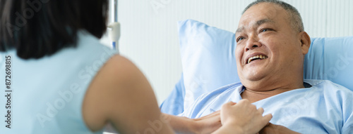 Fototapeta premium Cheerful asian nurse smiling and talking with elderly patient in the room.