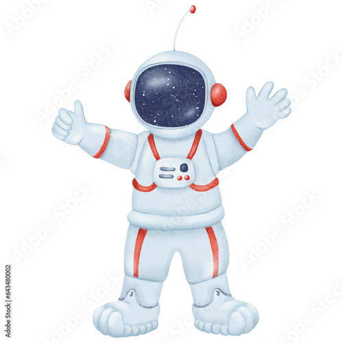 Fototapeta premium Cheerful astronaut waves their hand. Person in a spacesuit. Character stands in a helmet. Space travel, science fiction. Bright colors, illustration for children. Watercolor isolated illustration