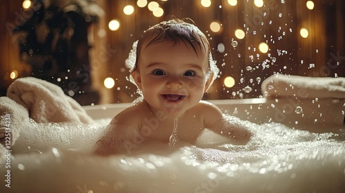 © 96, Fototapeta premium Cheerful baby splashing water in a bubble bath, with soft towels and cozy lighting nearby