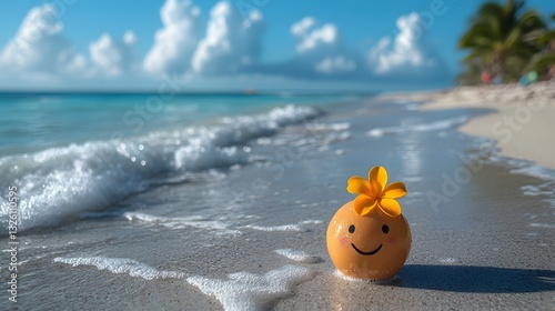 © Eakanan, Naklejka premium Cheerful beach scene with a smiling emoji on the sand