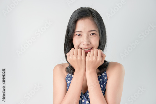 © sitthiphong, Fototapeta premium Cheerful beautiful Asian woman happy face smile on gray background.