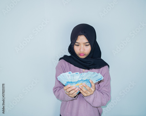 © Roovi, Obraz premium Cheerful beautiful Asian woman in a hijab showing Indonesian rupiah banknotes, celebrating luck isolated over white background. People religious lifestyle concept. ramadan concept. holiday allowance