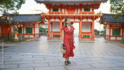 Fototapeta premium Cheerful beautiful hispanic woman enjoying the traditional grandeur of yasaka...