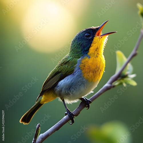 © Rostyslav, Obraz premium Cheerful Bird Perched Amidst Blossoms, Singing Happily