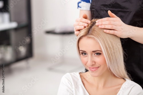 © Yakobchuk Olena, Fototapeta premium Cheerful blond girl is attending hairdressing salon