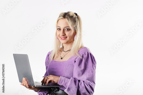 © platinumArt, Naklejka premium Cheerful blonde woman blouse isolated over white background holding a laptop, smiling at the camera with a confident expression. Typing on laptop keyboard. Creating web design or digital work.