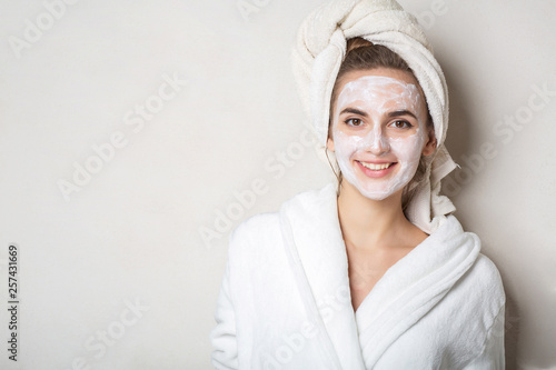 Obraz premium Cheerful brunette model with moisturizing cream mask and bath towel on head. Empty space