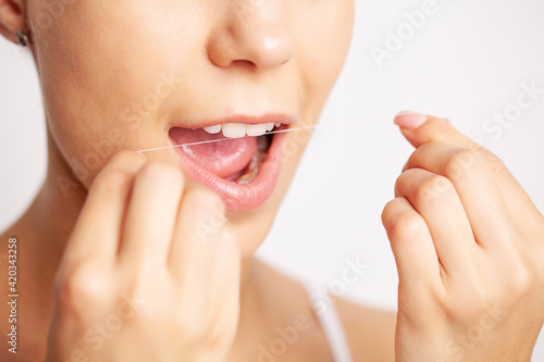 © Maksymiv Iurii, Obraz premium Cheerful brunette woman using dental floss in bathroom