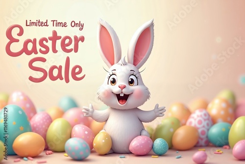 Obraz premium Cheerful bunny surrounded by colorful Easter eggs, festive celebration. Greeting card or holiday poster for Happy Easter promotion
