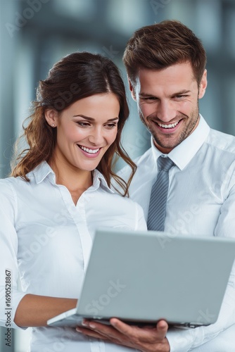 © Horizon, Obraz premium Cheerful business team collaborates on a laptop, sharing a positive expression with modern office background