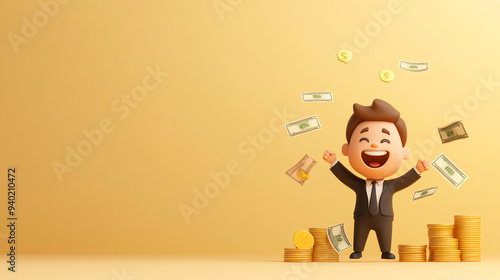 © Weerapat, Obraz premium Cheerful businessman enjoys success and wealth while surrounded by coins and money, conveying prosperity and financial dreams.