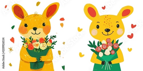 © karnsinee, Naklejka premium Cheerful cartoon animals holding flowers whimsical art digital design