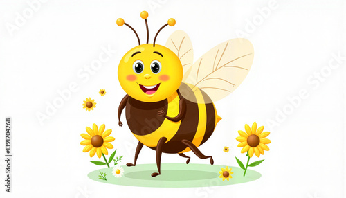 © Khelga Volkova, Obraz premium Cheerful cartoon bee smiling and running among flowers