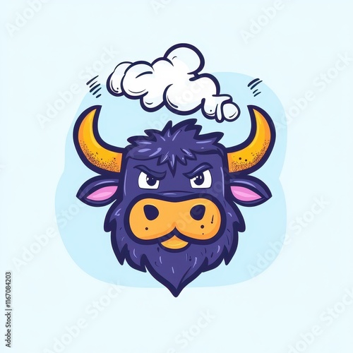 © Danudet.C, Obraz premium Cheerful Cartoon Bull Head with Exaggerated Features and Playful Expression Surrounded by Light Blue Background and Whimsical Cloud Thought Bubble