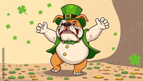 © beldesigne, Naklejka premium Cheerful Cartoon Bulldog in a Leprechaun Outfit Celebrating St. Patrick's Day with Clover and Gold