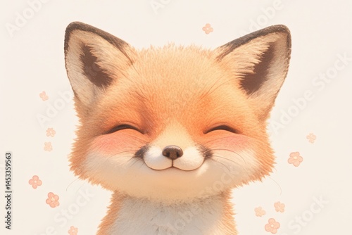 © Nonot, Obraz premium Cheerful cartoon fox smiling with eyes closed among tiny floral ornaments
