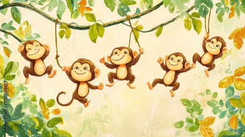 Fototapeta premium Cheerful Cartoon Monkeys Swinging in the Jungle