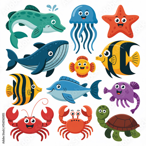 Naklejka premium Cheerful cartoon ocean creatures collection sea life dolphin