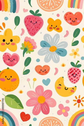 Fototapeta premium Cheerful cartoon patterns with cute fruits and flowers