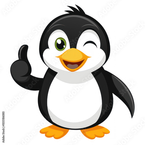 © Diclonius, Fototapeta premium Cheerful Cartoon Penguin Giving a Thumbs-Up Pose With a Playful Wink on a White Background