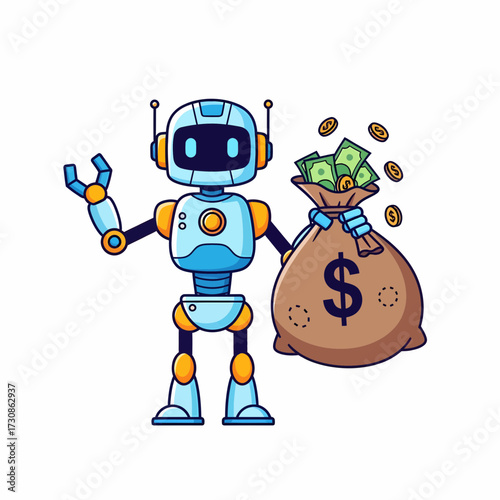 Fototapeta premium Cheerful Cartoon Robot Holding a Bag of Money with Coins and Bills.