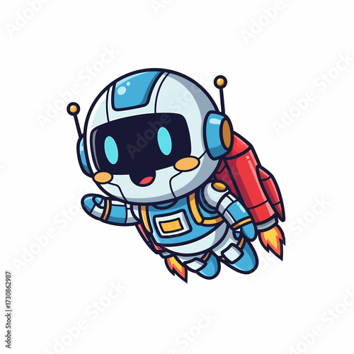 Obraz premium Cheerful Cartoon Robot Soaring with Red Rocket Pack and Fiery Exhaust.