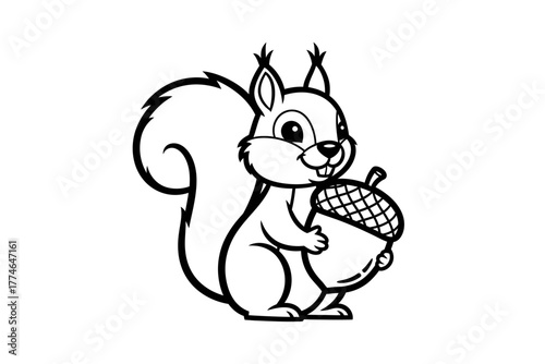 © Art, Naklejka premium Cheerful cartoon squirrel holding an acorn, set against a simple white background, ideal for children's designs