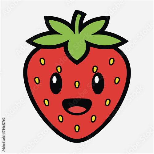 © mfnmedia, Obraz premium Cheerful Cartoon Strawberry with Smiling Face and Green Leaves Vector Illustration.