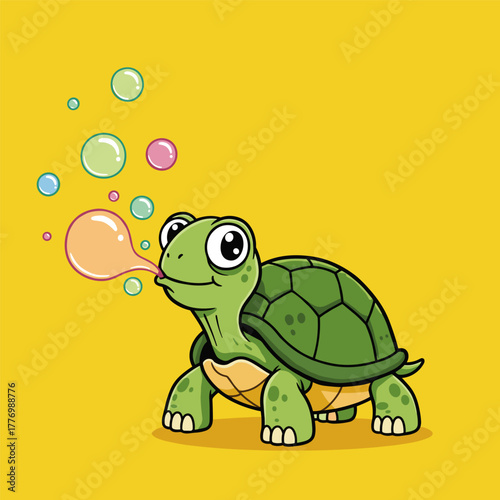 © bima, Obraz premium Cheerful cartoon turtle blowing colorful soap bubbles against a bright yellow background.