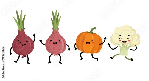Naklejka premium Cheerful cartoon vegetables joyfully leap and dance together against a blank white background.