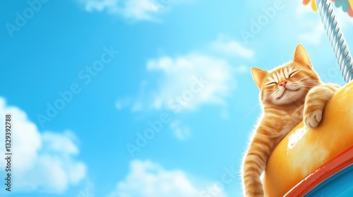 © Nisit, Fototapeta premium Cheerful Cat Stretching on Carousel Ride Under Clear Blue Sky with Fluffy Clouds