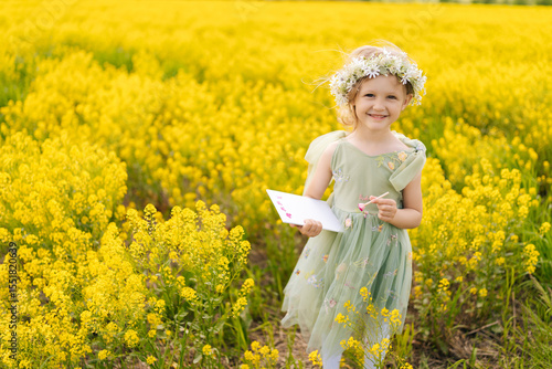 © dikushin, Fototapeta premium Cheerful child girl wearing flower wreath and fairy costume standing posing at blooming field during sunny summer day, drawing on canvas, enjoying beautiful nature. Concept of happiness childhood.
