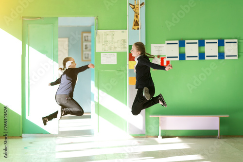 Fototapeta premium Cheerful children jump in the school hallway. Two girls schoolgirls jump in height at school during holidays.