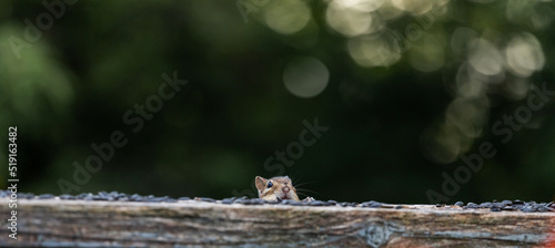 © Liubov Kartashova, Fototapeta premium Cheerful chipmunk is playing hide and seek