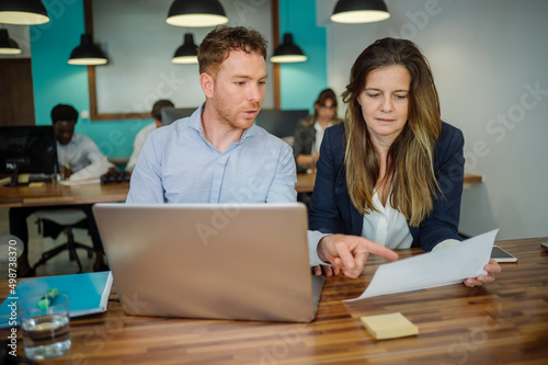 Fototapeta premium Cheerful colleagues working on laptop in working