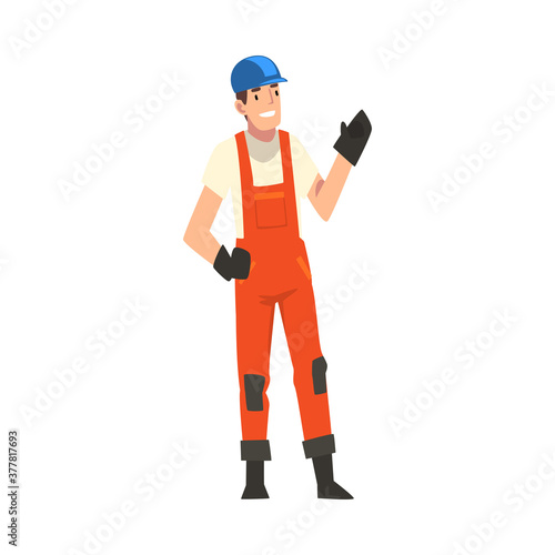 Fototapeta premium Cheerful Construction Worker, Male Builder Character Wearing Uniform and...
