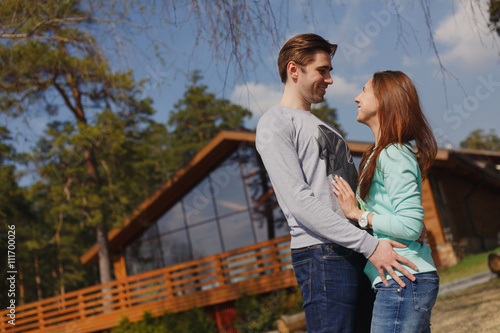 © Diflope, Fototapeta premium Cheerful couple standing in front of new house