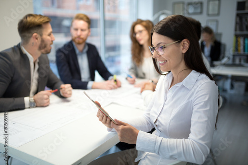 © NDABCREATIVITY, Fototapeta premium Cheerful coworkers in office