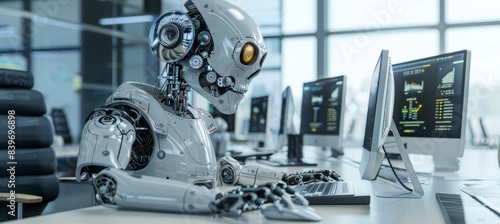 © Andrei, Fototapeta premium Cheerful customer service robot at work on computer in blurred office setting with copy space