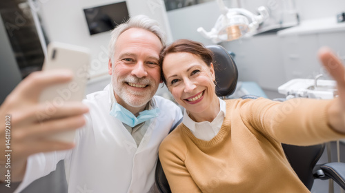 Fototapeta premium Cheerful dentist and patient selfie dental office portrait relaxed smiling